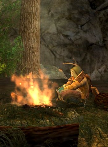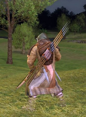 My hunter is a vagabond. He only exists for the sake of adventure and the thrill of discovery. He lives on the road with only the bare necessities. He has only one set of clothes and they have been patched up time and again to make it through another round. He is broke, looks scruffy and generally below any person’s standard. For his outfit I used only the most basic items, and they provide him a real wayward and worn down look. It is a shame there are no cosmetic weapons available in Lotro because I would have him equipped with only a dull knife and a simple short bow. Higher level stuff already starts to look too fancy. I tried several different cloaks and backpacks but in the end settled on the warden’s pack. Even though he is not a warden, he does make wooden weapons and this backpack is what provides the most rugged look.