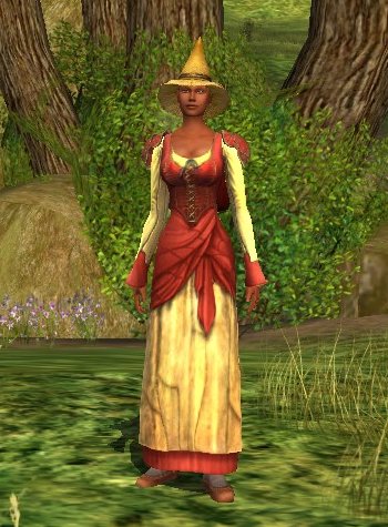 This outfit is simple and very accessible. It is funny how I sometimes start out with a very complex idea, and then end up with the simplest of dresses. This dress comes from the outfitter, the shoulder pads from the medium armour smith and the backpack is crafted. The sun hat is a seasonal item for this Spring festival.