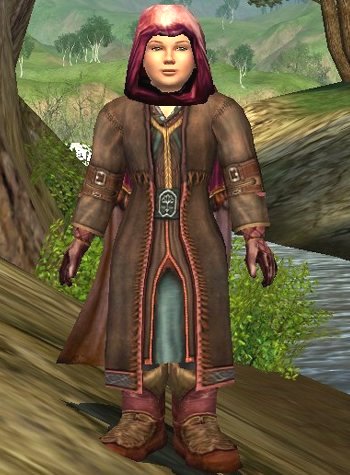 The cloak on this outfit has a unique and undyeable colour. It is somewhere between rose, fuchsia and burgundy, adorned with tiny brown tassles and because of its unchangeable colour a challenge to combine. It comes from the Garth Agarwen Fortress instance where most players discard it because of its pretty lousy stats. As a cosmetic it is quite valuable though (uhm well, in my opinion as a cosmetics addict), so definitely worth the “need” roll. I found the scholars robe and the colour blend on the Westernesse boots to be a pretty good match, but I am curious about other options, so if you happen to come across something, please let me know. The gloves are borrowed from my Runekeeper.