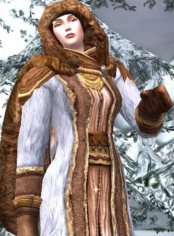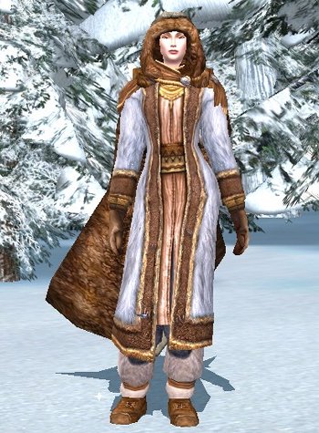 For most of this outfit you will need kindred status in Forochel, as you cannot wear the robe or the cloak without it, but you get access to many nice cosmetics and tailoring recipes once you get there, so for cosmetic reasons it is well worth the grind. This outfit has a funny detail: the mitts are actually oven mitts (a skirmish reward), but they are perfectly fine to keep your hands warm as well!