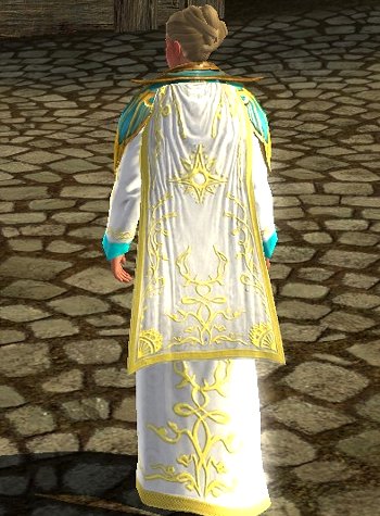 I left the robe in its default state as dyeing doesn’t improve it at all. The only thing I added are some Mirkwood minstrel shoulders as a finishing touch. I have my woman loremaster modeling the robe as I think it best suits a woman and looks rather plump on an elf. When the cloak is used on a hobbit it has the regular long cloak length, on man and elf it is shorter.