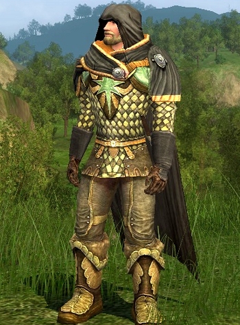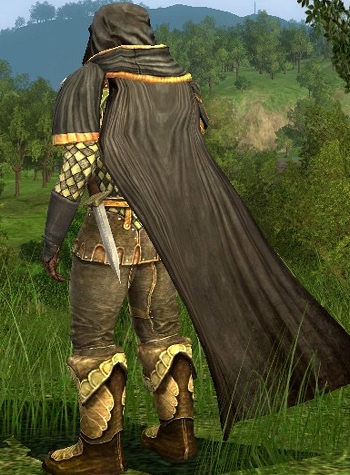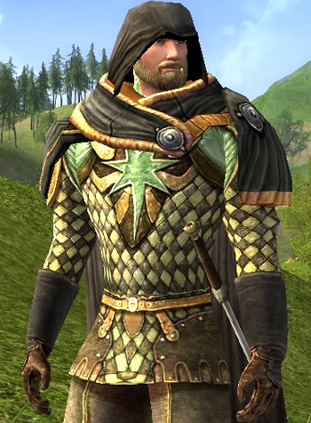 The Rangers of the Grey Company were dressed in dark grey cloaks and openly wore a silver brooch shaped like a pointed star during the War of the Ring. Admittedly this outfit doesn’t feature a silver star brooch, but rather a green star on the chest. I guess that’s as good as it gets in Lotro outfitting.