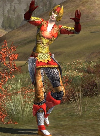 Surviving the first Book of the Volume II epic questline as a heavy armour class, nets you a nice chest piece that, as far as I have been able to trace, does not appear elsewhere in the game. Only the top part can be dyed, the gold and light red does not dye along. I chose red because it intensifies the light red area of the chest piece, and combined it with a few other red pieces.