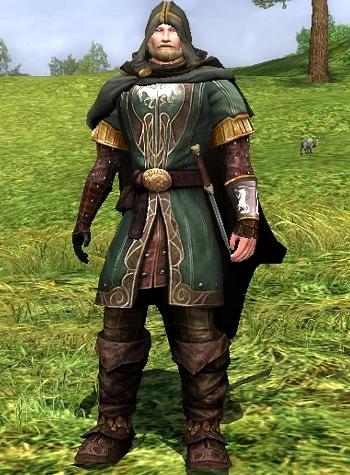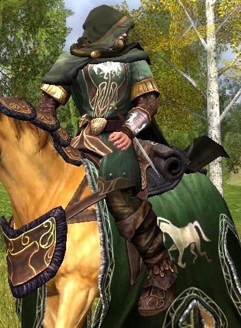 So here it is, the green version of the Isengard expansion cosmetics. The three sets are all slightly different, as they have different emblems. I thought I would like the white version best, but in game it wasn’t as good as I thought. The cloak is not true white but more of a washed colour. Not ugly, but not really white. The emblem on the white is a light green horse head. So I think I will leave the white set to make some other combination some day. The red set is very nice. It has a star emblem and I will try that on a female sometime. My favorite for now is the green set, so there.
