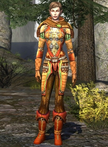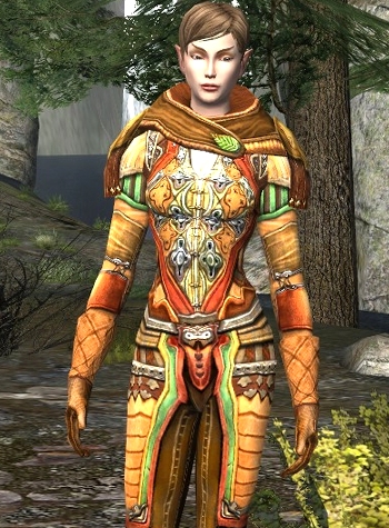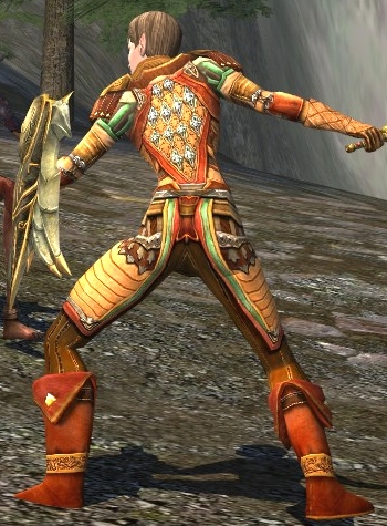 I do have one outfit slot dedicated to battle. I like to keep a good view of what is going on so I usually don’t use cloaks during battle as they tend to get in the way. I either don’t equip them or switch them off. Since I view my character from the back all the time I do like it when the back part of the chest piece is decorated. My favourite battle outfit (and sort of my signature outfit) for my minstrel is the Everstout. It’s a rare drop from Barad Gularan, but I’ve been told it drops in Carn Dum as well. The matching leggings come from the same place. Both pieces are not bind on acquire, so you may find them on the Auction House sometimes. The same design might be available as a regular yellow world drop under a different name as well.