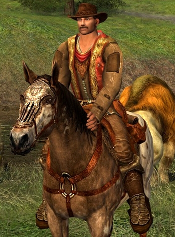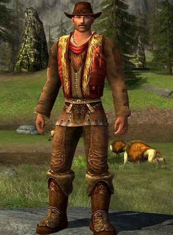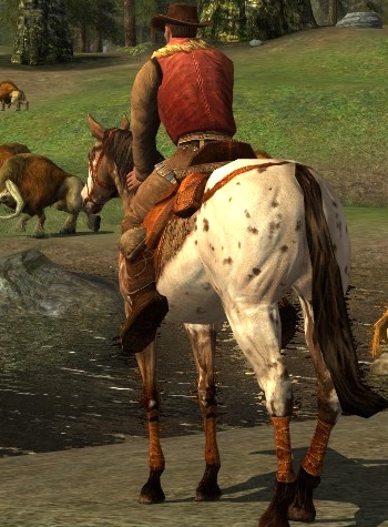 Still inspired by the horse outfits, yet in the mood for something completely different, I decided to go for something new within my wardrobe. I am a horse rider myself and I have always loved the Western riding style. It allows the horse a lot of freedom and encourages verbal and gentle communication between rider and animal. Hence my two favorite horses in the game are the Prized Dark Chestnut Horse from the Wardens of Annúminas and the Prized Eglan Horse from the Eglain, as they most resemble the North American Pinto horses. Even so, I am not entirely sure how this style fits within Middle Earth culture, but the outfit system does have several items available that have the right looks. As a result it isn’t hard to look like an “aurochboy”.