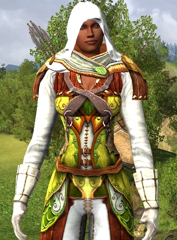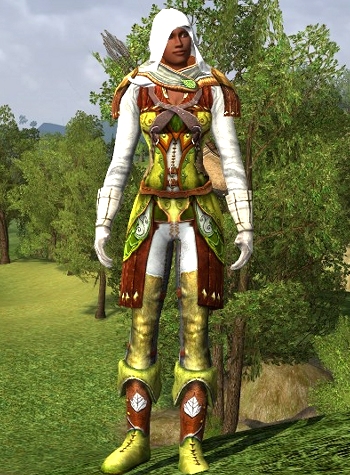 The armour pieces in this outfit come from bartering tokens from the Annúminas instances. This is a mix of level 50 medium and light armour, and there are also cosmetic versions available (ceremonial armour), which can be used by any class. The Annúminas instances start at level 40, so if you start early you will have enough tokens by level 50 to buy yourself a full set, or save up a little longer to buy all the ceremonial sets. The level 65 version of these sets is purple/yellow and cannot be dyed, and therefore less interesting as cosmetic armour (unless you really like purple and yellow).
