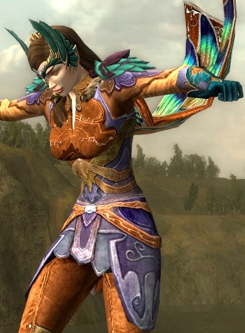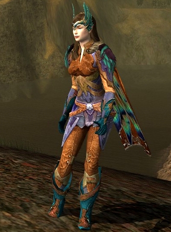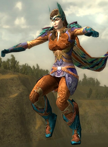 Yesterday a kinmate, who sees me in a different garment everyday, asked me how on earth do I come up with all these different outfits every time? Truly I don’t know. I guess it’s a way to allow my creativity to be part of my biggest hobby: Lotro. I cannot help but always look at armour and cosmetics and come up with new ideas and new ways to combine old things, my imagination just does it by itself. There are so many armour pieces and cosmetics in Lotro, that I always see and find new combinations. Yesterday I felt creative and colourful. The result is an outfit designed around the awesome luminescent colours of the Cloak of the Dragonfly. It makes me feel like a fairy and I truly believe I can fly…
