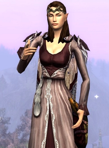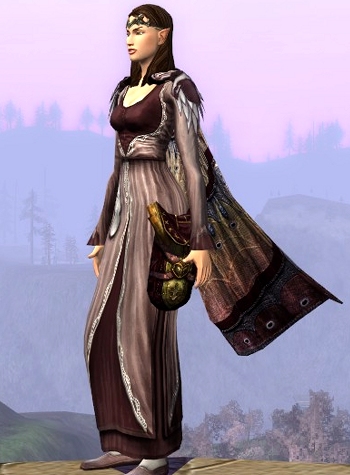 I hope everyone is buying their wish-list cosmetic items from the Lotro store at a discount this week and enough Wardrobe space to share them with all their characters. I noticed that cosmetics go on sale about every 3 months or so, and sometimes it’s cloaks, sometimes head pieces, sometimes clothing, but never all at once. The same goes for Wardrobe space, so these opportunities do not come very frequently. If there is something you still wanted from the store, then now is the time to get it. However don’t forget that many cosmetic items are also available in game one way or another. The elegant dress in this outfit is available from the store, but is quite easy to obtain with skirmish marks as well.