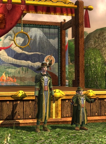 This Saturday Devonna from LotroStylist and myself were invited to be the judges at the Fashion contest in Crickhollow, organised by the Second Breakfast kinship at the theatre stage of their kinship house. Devonna and I had to create a new character on the server to be able to attend. Being that this was a fashion contest, and since we both had an official position at the event, we decided that we should be dressed appropriately. Now it’s really strange to dress up as a fresh level 6, without access to wardrobe or any of the cosmetics that we have on our home servers. Still we managed to find proper attire in Michel Delving, as the outfitter there sells the Fancy Robe that I was able to afford with the few silvers I received in the starter instance. Devonna and I found we had matching cloaks as well in our inventory, and we chose our own accessories from a selection of beginner’s quest rewards. Daisygold, the host, was kind enough to send us a few dyes for the finishing touch.