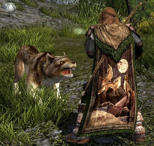 The cloak in this screenshot is a particular favorite of mine, as I always wear it in at least one of my outfit slots (have six, still one to go). Some people think it’s a bit cheesy, but I like it. (Note the wolf in the background and the wolf on the cloak 🙂 ).