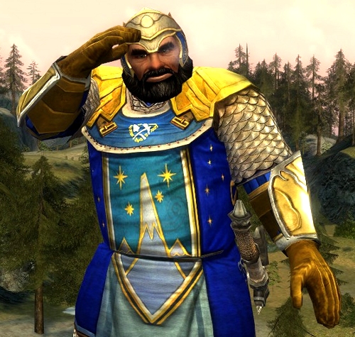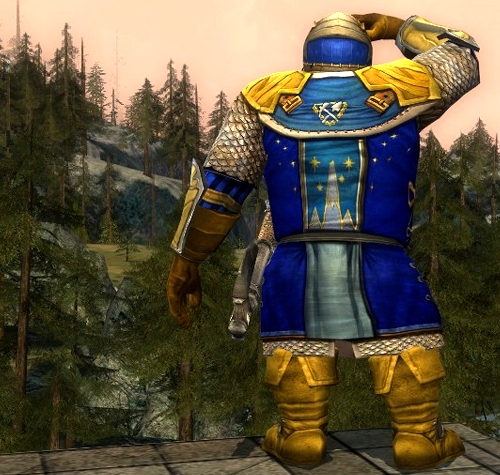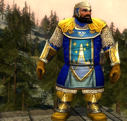 I did something I never thought I was going to do: I started a dwarf character! Last week the character slots were on sale, so I took the opportunity to open up an extra slot and fill it with the only race and class that I have never played before: a dwarf guardian. After ten levels I must say that guardian is most definitely not my class, but I am not giving up yet! Even though he is still a low level guard, I had to give him an outfit that looked a little better than the boring medium leather stuff from the quest rewards. To my surprise I found that items that I usually discard from my inventory, actually suite a dwarf very well! One such item is the Hauberk of the Mithril Guard. This item appears in my inventory each time I create a new character, and I actually never used it on any of my other characters. However, I think it’s very appropriate for a dwarf! The hauberk has a dark blue-greenish shade as base colour so it only dyes well in darker colours and blues are best. The shoulders on the hauberk are coloured in a beautiful bright gold so it would be shame to cover them up with anything.