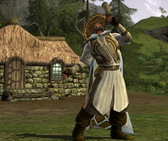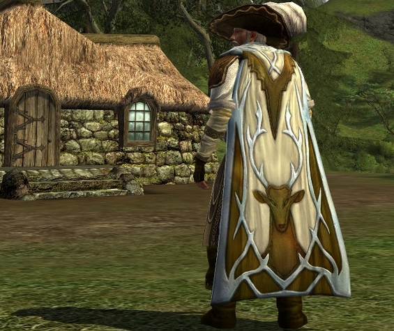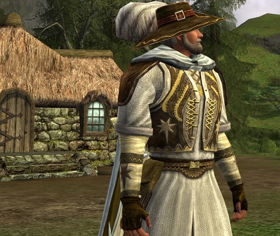 Though this robe is technically a Lore-master’s robe, bartered in Evendim for Arnorian coins, any class can buy it and use it cosmetically through the wardrobe. At least, that’s how it used to be before Update 5. I’m not sure how the situation is currently, and I am not able to test it out myself. The robe is different from the crafted Tier 3 Traveller’s Robe because it has stars on the chest and sleeves. On top of that the robe’s original base colour is a very special kind of powdery blue, a colour that cannot be obtained with any dye. However for this outfit I chose to dye it white.