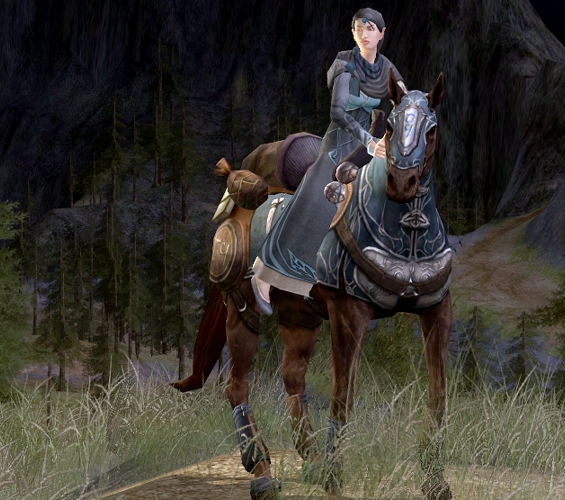 The perfect match to this steed is the Rivendell Elven Dress. Dyed grey it closely matches the colour of the steeds’ tack. I matched it with minstrel shoulders that can only be bartered for if you have PvMP rank 3, but these can easily be replaced with something else. The new Isengard instance shoulders for example are a good substitute here. I’ve also tried dying the shoulders and runesatchel in sea-blue. This brightens up the outfit considerably and is a good match as well, though not as close as grey. You can place your runesatchel in the wardrobe and dye it in any colour you like.