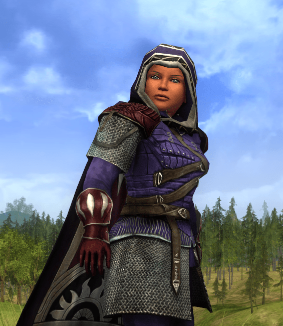 Lovely combination! The color matches her eyes! And the gauntlets even look good. I’m not a big fan of them normally, but here they really go well with the bold silver blocking on the cloak.