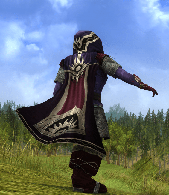 The cloak in this outfit is a reward from the Great River quest A Bold Rescue. The base colour of the cloak is very dark, which makes it hard to dye. The rose dye that I used gives the outline a deep indigo colour while applying a deep rose hue to the center.