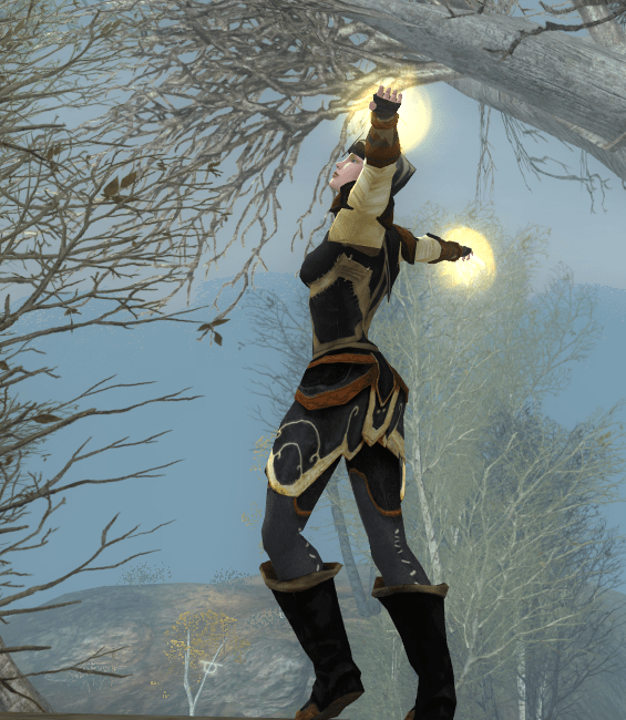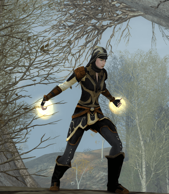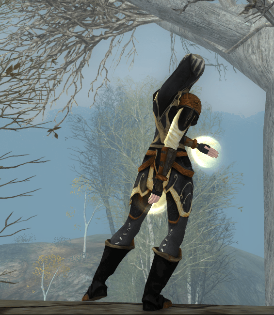 The head piece in this outfit has a long pointed veil that drops down at the back. You can cover that up with a cloak or shoulder guards, but it’s actually a very nice detail that should be visible. The wrapping around the neck is part of the head piece as well, which I think looks a bit better in combination with a top that covers up the chest. The classic pieces from the Light Armour vendor in Rivendell relentlessly find their way back into my wardrobe every once in a while. These pieces are so versatile that they fit into almost every combination.