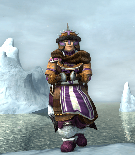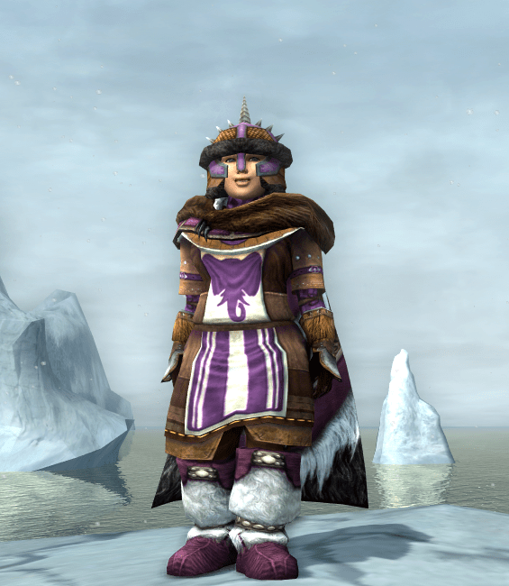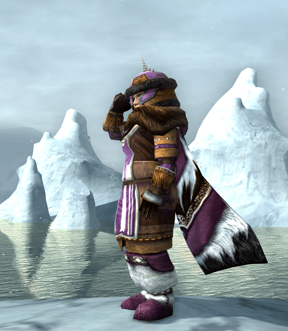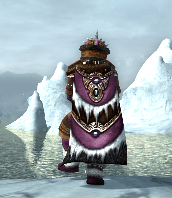 I kept a helmet from her adventures through the Lone Lands in her vault that I think is absolutely perfect for a cold weather outfit and the pattern on the hauberk refers to the large mammoths that the traders in Forochel use to carry their wares around.