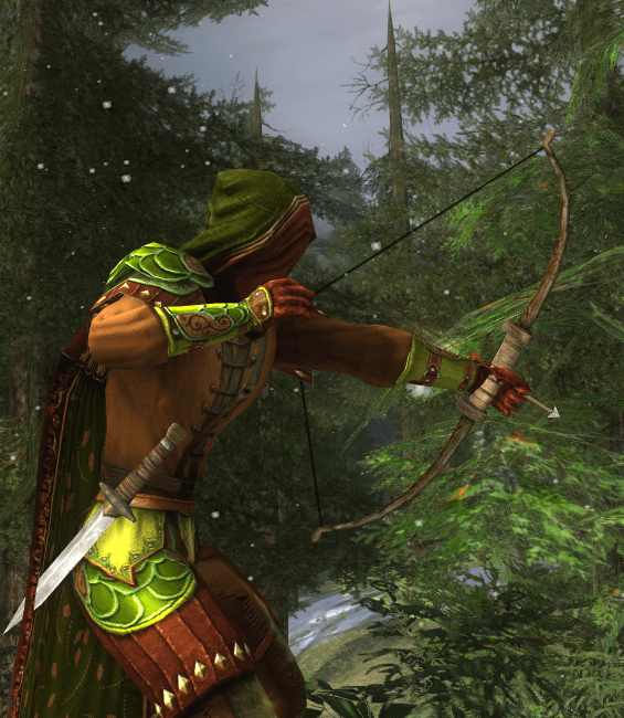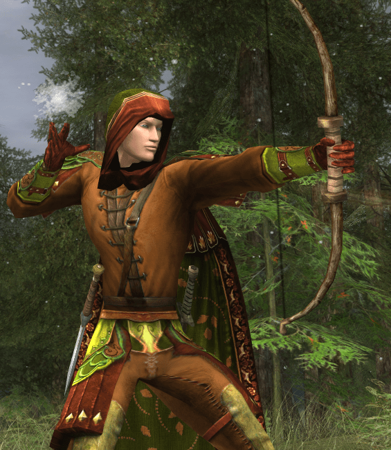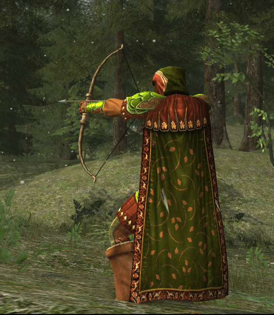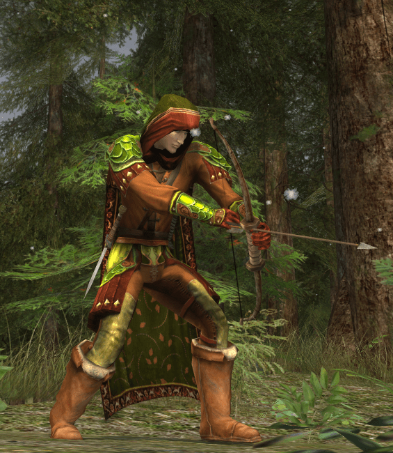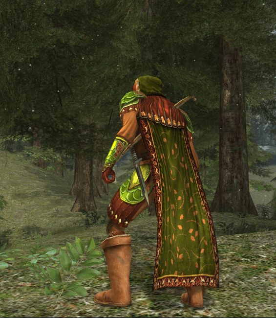 As much as I love the Elves from Tolkien’s lore, because of the way the male Elves were designed for Lotro I tend to avoid my male Elf characters. Their bodies are not balanced, their shoulders too broad compared to their hips, their legs and arms have the shape of a ballerina ready to dance and their feet are much too small compared to the rest. When making an outfit for my male Elves I always seek to compensate for those imbalances. I avoid big shoulders, use leggings with a little “padding” and try to find boots that add a few inches to their shoe size.
