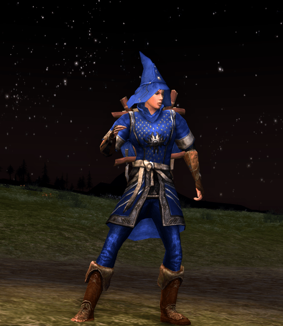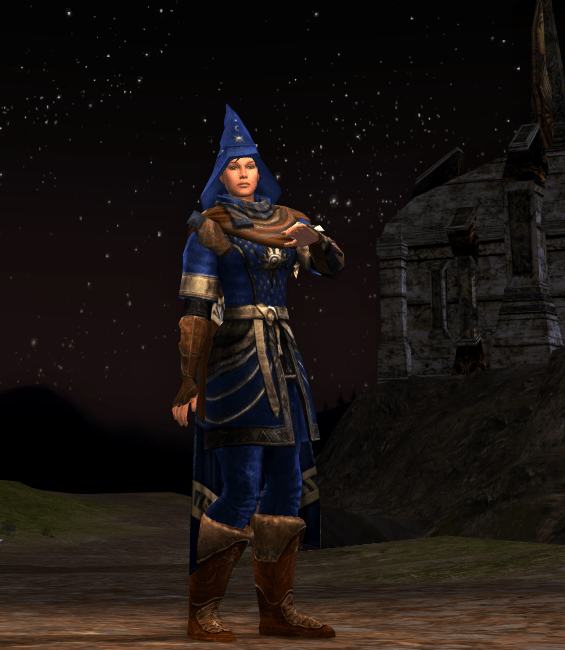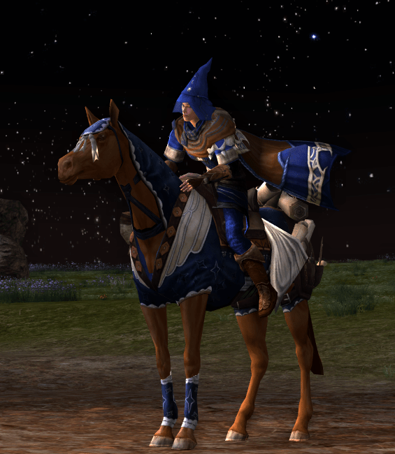 As the Riders of Rohan release date is getting closer, we are all aware that soon our high level items and armour will be obsolete. As with the Rise of Isengard expansion I expect my seals to be converted to medallions and the prices of raid pieces lowered. Nevertheless at the moment I still have a lot of excess medallions and seals, which I can use to purchase armour pieces for cosmetic use. The chest piece used in this outfit is actually for Wardens and can be purchased at the Ox-clan Camp near Isengard. And since my warden is hardly likely to ever reach level 75, I purchased it exclusively for the looks. I think the starry design on the chest matches the Lore-master theme quite well. The chest piece has a nice neckline which looks perfectly fine without shoulders too. The Hunter and Burglar class have a similar chest piece, but with a different emblem on the chest, but their matching gloves are all the same. However there is a slight difference when dying those items as the Burglar version seems to be more muted. I couldn’t make up my mind whether or not I should match the steed with a backpack or a cloak, so I used both.