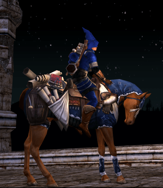 Thank you for your kind compliment! I agree with you that the mount has a good and a bad part. The good being the scrolls, sacks, books, quills, the bad part being the pajamas. I wish they would make more natural looking class horses, like the Steed of the Hunter, with more manes and rugged looking features. I really fear for the Minstrel Horse now 😦