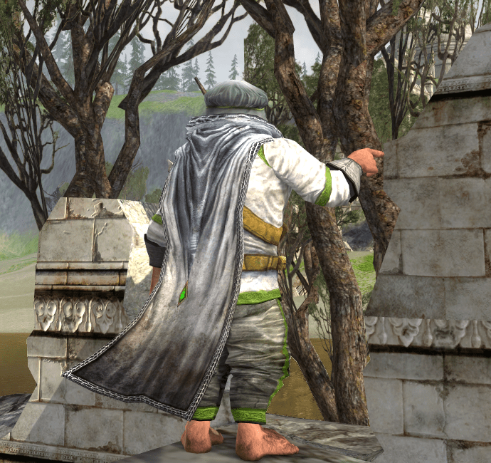 Back: Cloak of the Unwelcome Guest, white dye (Great River quest reward, light armour)