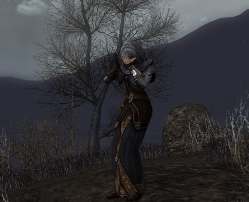 Head: Worn Ranger’s Hood, grey dye (Vol.III Book 5 reward, cosmetic)