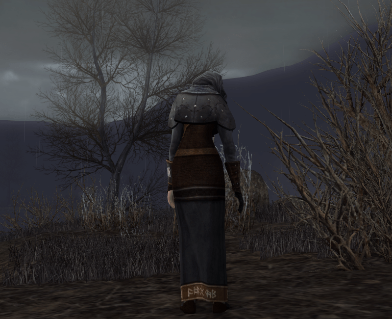 Feet: Refugee’s ragged shoes, grey dye (Rohan quest reward, light armour)