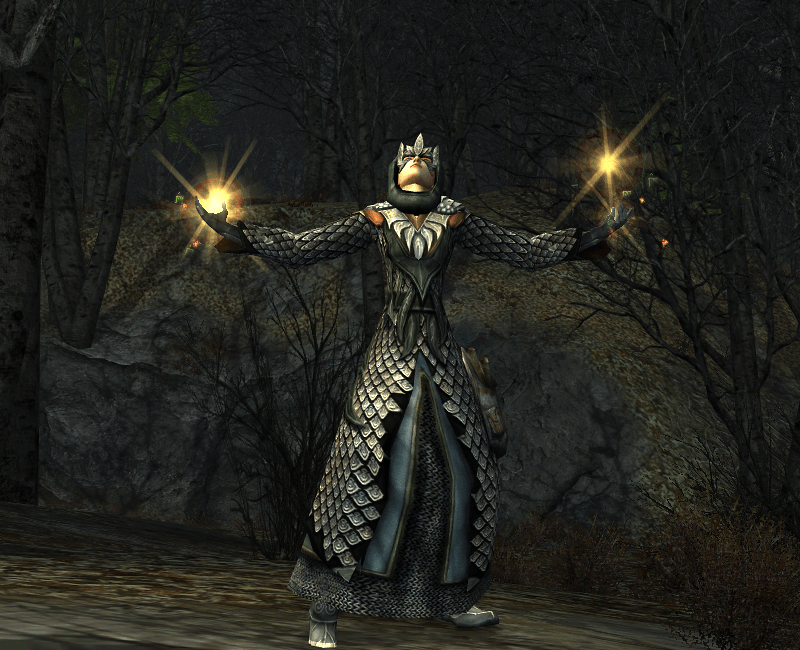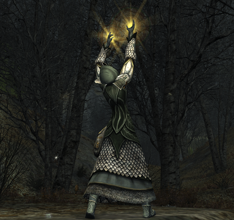 The Mirk-eaves, the landing right after Lothlórien, is a dark place indeed, and as you proceed further into Mirkwood, it only gets darker. It is a relief that after the destruction of the Ring, when we leave Mordor, we get to help set things right and heal the forest from the shadows. Nevertheless even the darker side of early Mirkwood has a beauty and a mystery in its own right. A good place for my runekeeper to help out the Malledhrim and show off another elvish outfit.