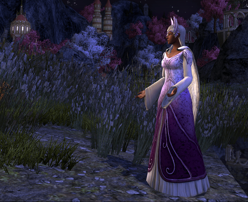 The Midsummer Festival was incredible. I loved all the cosmetics and housing items, and find myself with no less than three new dresses in my wardrobe! As my real life summer holiday is coming to an end, it’s time to post some of the ensembles that I have been using these past few weeks. I fell in love with the default color of this dress. It is very pretty dyed in other colors as well, but I go back to the default every time. The gradient lavender blending into a darker shade toward purplish burgundy is just lovely, and the decorative leaf scrollwork all over the fabric really shines when presented in its brightest default hue. So here’s the original dress that, combined with white feathers on shoulders and cloak, provides an almost ethereal appearance.