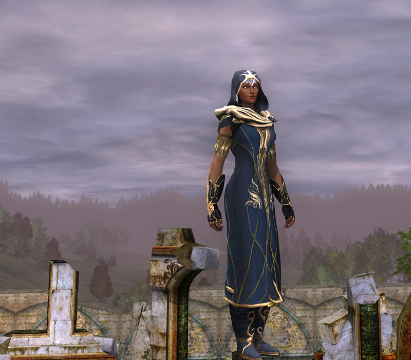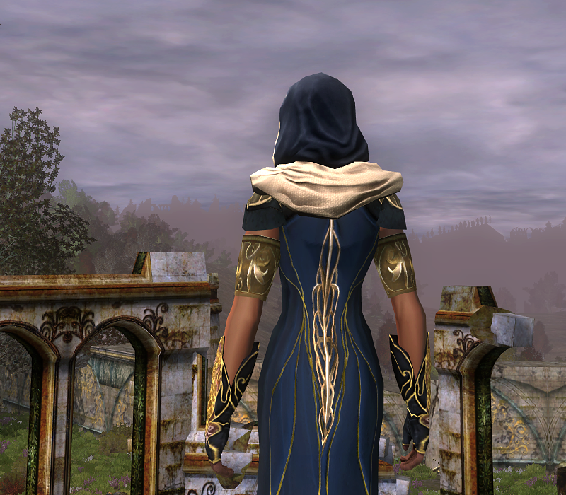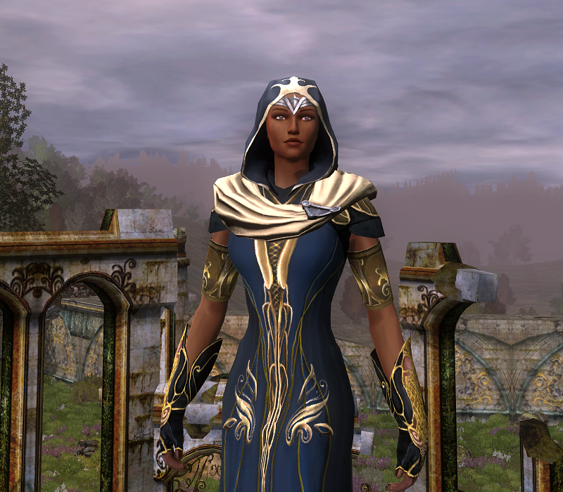 The Mantle of the Hidden Peaks is my all time favorite shoulder-piece ever. I have every single outfit equipped with this mantle. They are the absolute most versatile and most elegant shoulders and fit all races and classes. I finished this outfit with a relatively easy to get hood, from a lower level questing area, but the same hood can be obtained from Delvings. Even the Tier 1 Delvings drop this hood, albeit with a grey trim rather than gold trim. The Gloves can be crafted with Galadhrim reputation, but can also be bartered for in Dol Amroth.